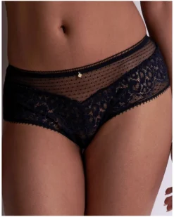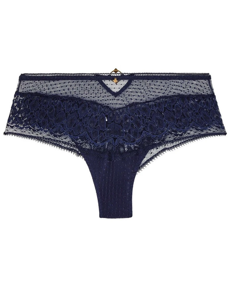 La culotte Saint-Tropez de la collection Illusion Fauve assure un look sexy et attirant de par sa coupe et sa dentelle façon écailles, elle est sublimée à l’avant par un bijou au bas du dos.