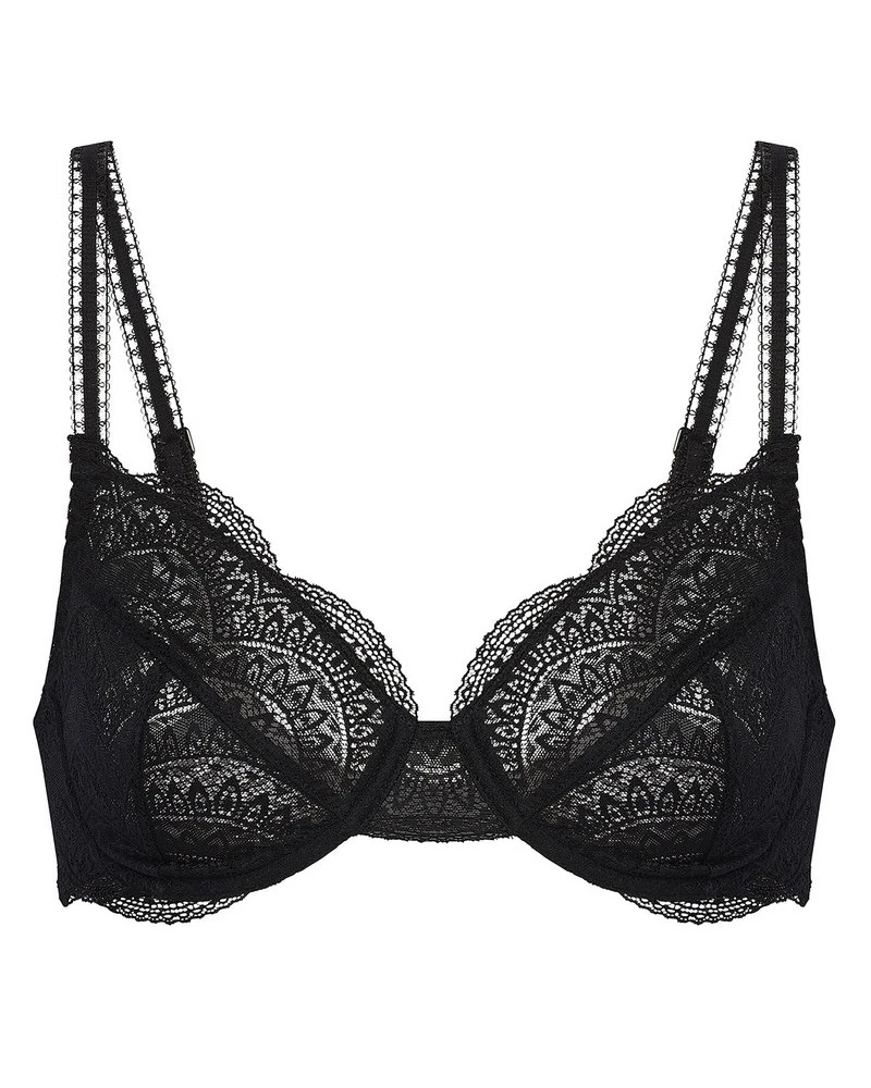 Le soutien-gorge armature Simone Pérèle de la collection Karma offre un confort parfait. Les bretelles sont réglables et se portent croisées dans le dos ou non. Une dentelle moderne et légère.