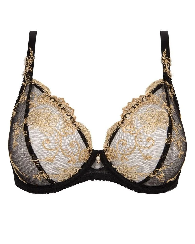 Le soutien-gorge triangle à armatures glamour Déesse en Glam de la marque Lise Charmel propose une coupe et des bretelles travaillées qui viennent mettre en valeur le décolleté plongeant. Les bonnets recentrent la poitrine en la réhaussant en douceur pour un galbe rond et sensuel.